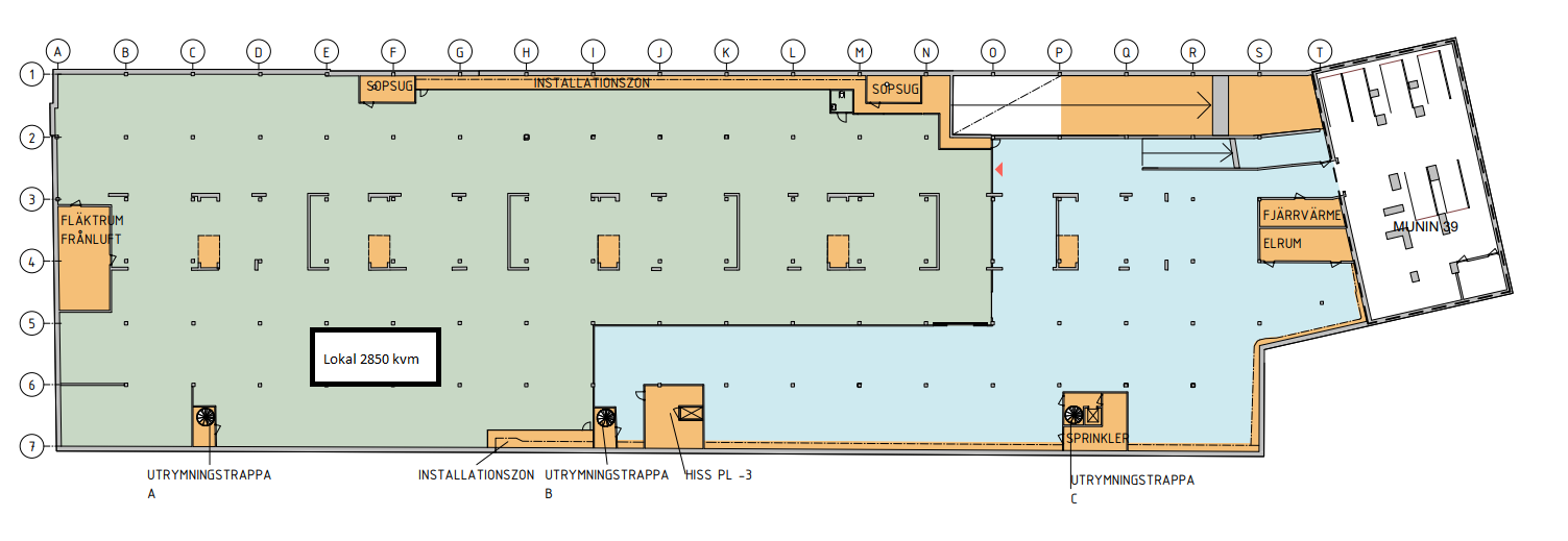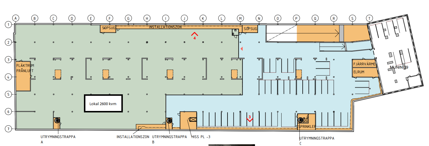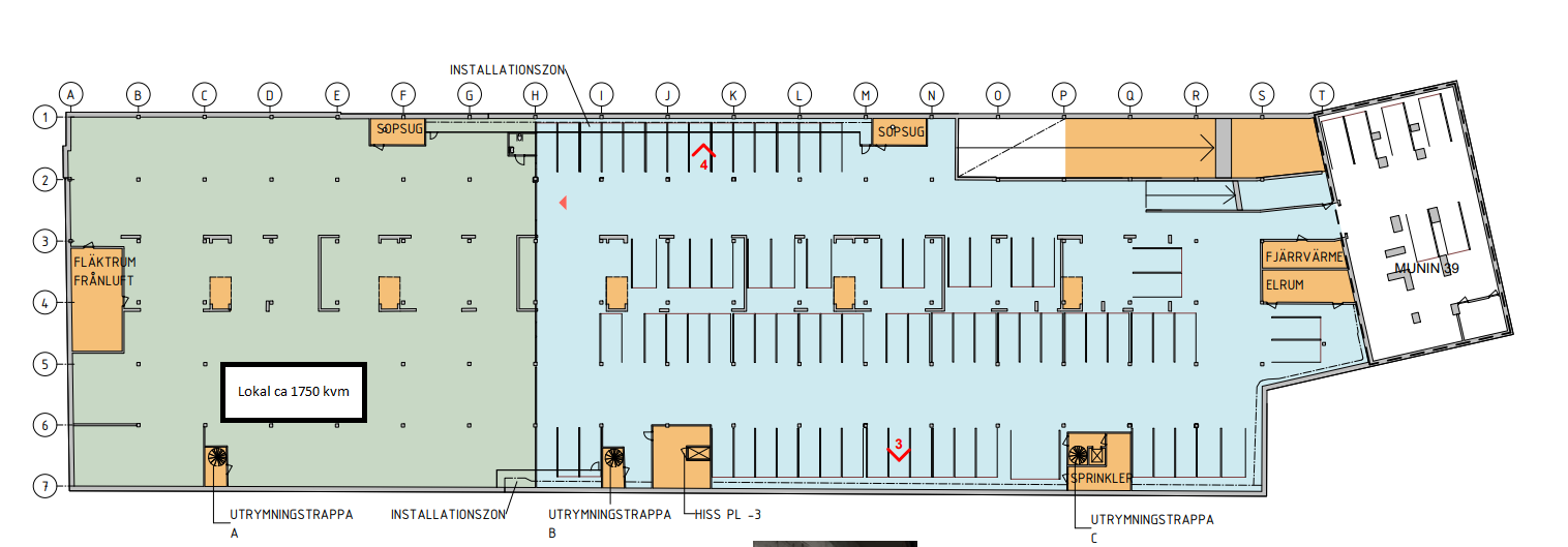 Ett garage plan på totalt 4 300 kvm, som går att dela på många olika sätt. Lokalerna går att bygga in i olika avdelningar. Nedfart till garaget är en ganska lång med en höjd på cirka 2,3 meter och ganska smal (normal bil bredd). Hyra 1.200 till 1 500 kr/kvm.