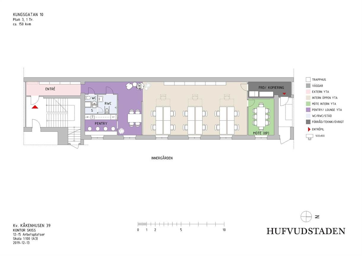 Lokalen är mycket trevligt och välplanerad med direkt anslutning till innergården. Lokalen kommer att genomgå en större renovering och tillträdande hyresgäst får en fräscha och moderna lokaler. Med öppen planlösning har kontoret plats för 12 – 15 personer. I lokalen finns det ett mötesrum, pentry och två toaletter, varav en med dusch.