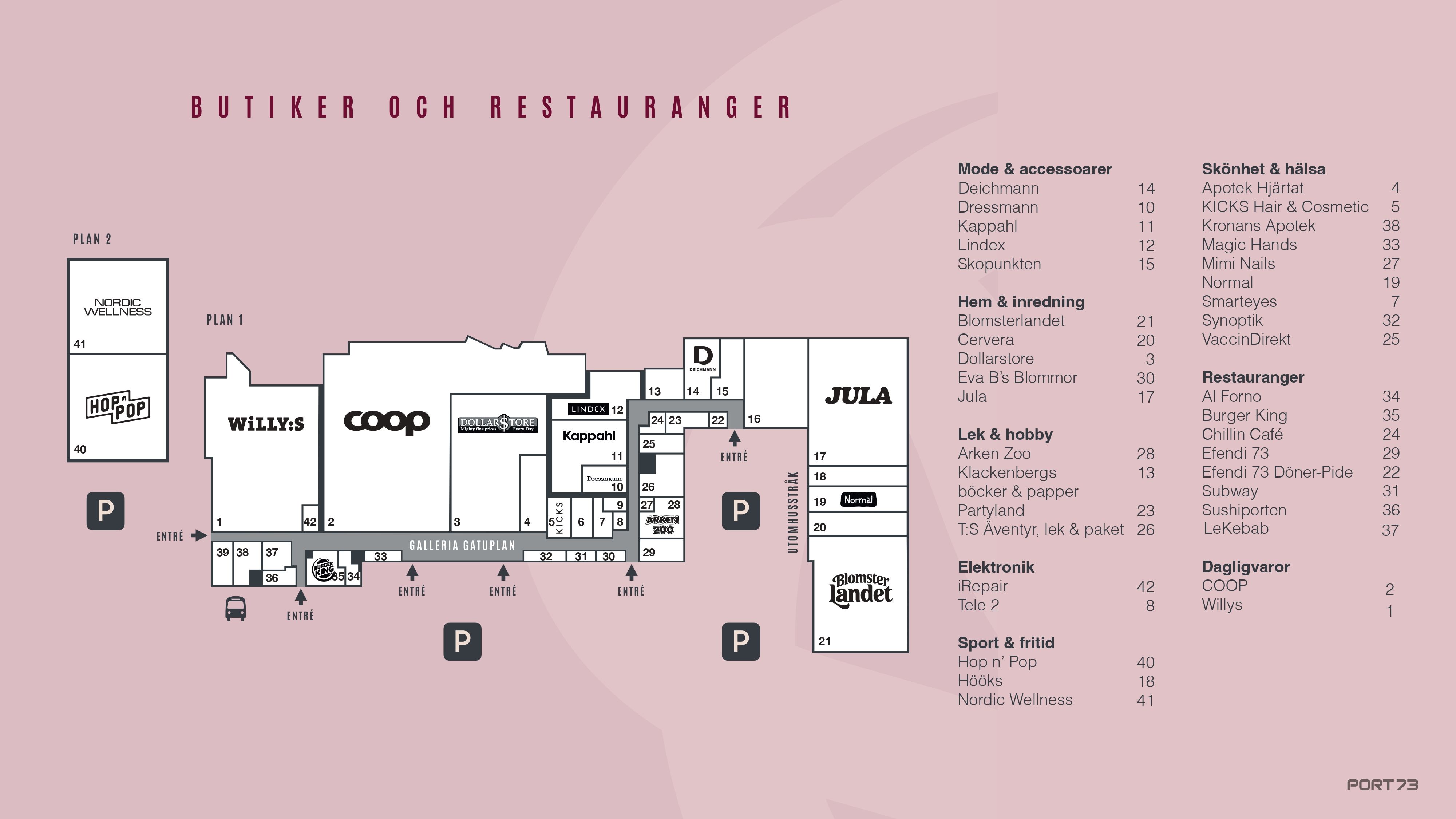 En allt-i-ett-destination! Med sitt strategiska läge är Port 73 den naturliga knutpunkten som länkar samman arbete, hem och vardag. Här är det enkelt att stanna till för att göra sina ärenden och samlas kring en god måltid. I takt med att Haninge kommun och Södertörn växer, stärks Port 73:s position som den centrala mötesplatsen i regionen. • 1 000st Parkeringsplatser • 100 000+ invånare • ca 5 miljoner årliga besökare • Starka ankarhyresgäster som: Jula, Coop, Willys, Normal, Hemtex, Dollarstore, Lindex, Arken Zoo m. fl. Varmt välkommen att höra av dig vid intresse!
