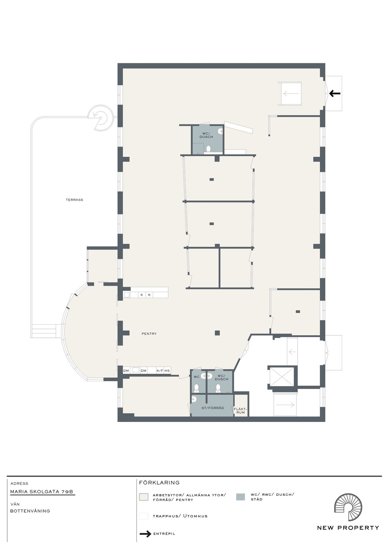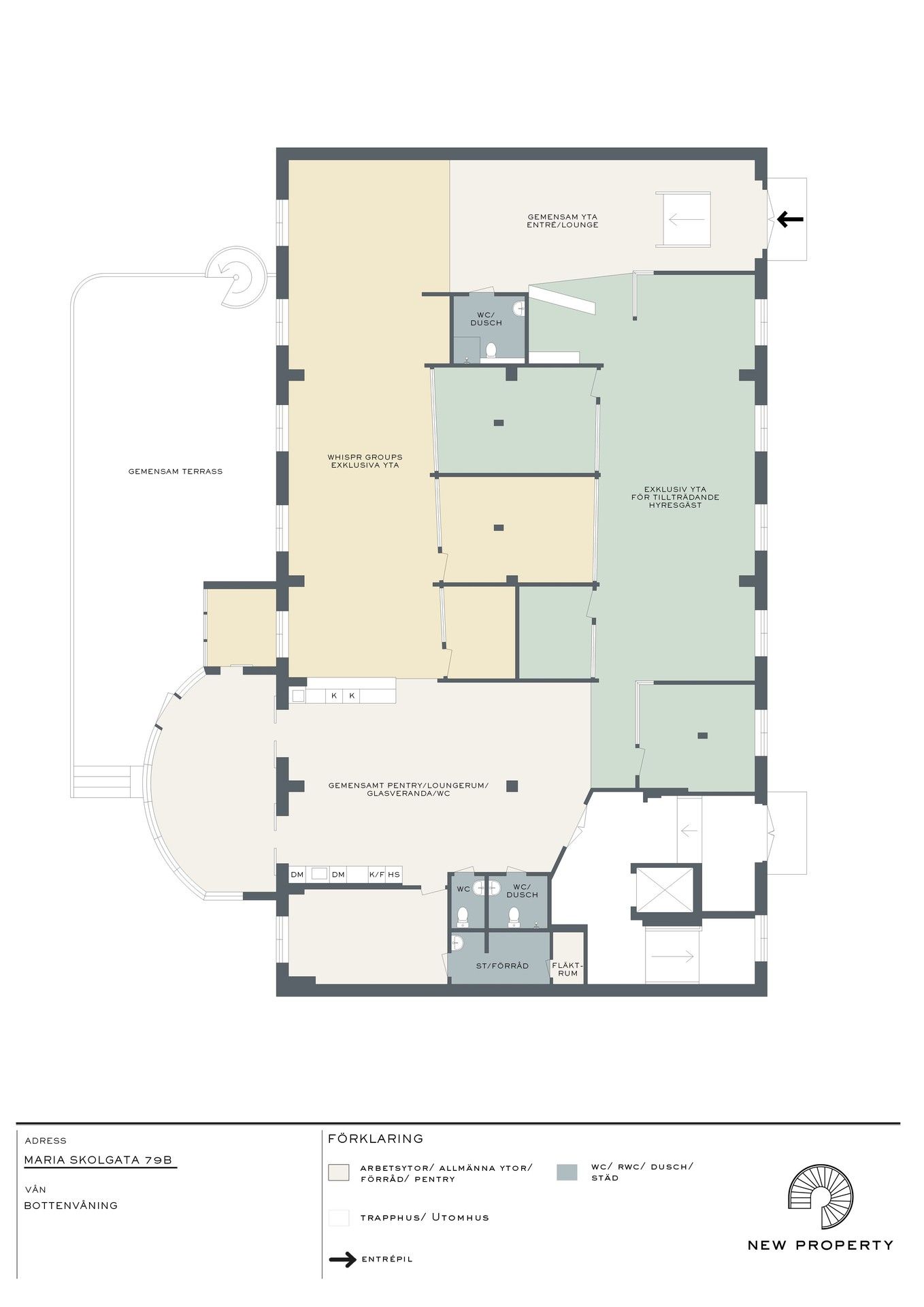 Fastigheten är placerad i populära kvarteret Tobaksmonopolet. I området blandas häftiga industrifastigheter med grönområden och det finns gott om service samt närhet till kommunikationer. Lokalen representerar mycket av den industriella och härliga karaktären som finns i området. Högt i tak, fantastiskt ljusinsläpp, effektiva ytor och en hög standard på lokalen. Från ingången, direkt från gatan, möts man av en härlig lounge och mottagningsyta. Stor öppen arbetsyta med fönster ut mot Maria Skolgata med plats för upp till ca 20-22 personer. Ett större konferensrum för upp till 8-10 personer, ett mindre mötesrum för 3-4 personer samt ytterligare ett arbetsrum för upp till 4 personer. Stort gemensamt pentry med en tillhörande glasveranda med direktutgång till 80 kvm terass i soldränkt läge. 3 wc totalt i lokalen varav 2 med dusch. Här delar man lokalytan med Whispr Group som är förstahandshyresgäst och som själva sitter i lokalen. Det är en tydlig avgränsning mellan arbetsytorna som gör att det känns som en egen lokal. Entrén, pentryt och lounge delas med Whispr Group. Här hyr man ett nyckelfärdigt kontor som är fullt möblerat, media/it, m.m. - Allt på plats, bara att flytta in! Fördelning av lokalyta: Ca 150 kvm exklusiv yta för tillträdande hyresgäst med plats för runt 20-22 personer plus ett rum för 4 personer, ett stort konferensrum och ett mötesrum. Ca 145 kvm gemensam yta med entré, lounge, pentry, toaletter och glasveranda med direktutgång till 80 kvm stor terrass. Se ritning "fördelning av lokal" för förtydligande av lokalytan. Lokalen hyrs ut med flexibel hyrestid och mot en kostnad om 90000 kronor/mån exkl. moms. Hyra inkluderar fastighetsskatt, värme/kyla, avfall, larm, möbler och media. Tillträdande hyresgäst och förstahandshyresgästen delar på löpande kontorskostnader såsom städ, el och internet, kaffe m.m. enligt separat ök. Känns lokalen för liten? Det finns även möjlighet att ta över lokalen i sin helhet om 440kvm, se länk för mer info: https://newproperty.se/hyra/kontor/stockholm/sodermalm/maria-skolgata-79b/22365 Hör av dig så berättar vi mer!