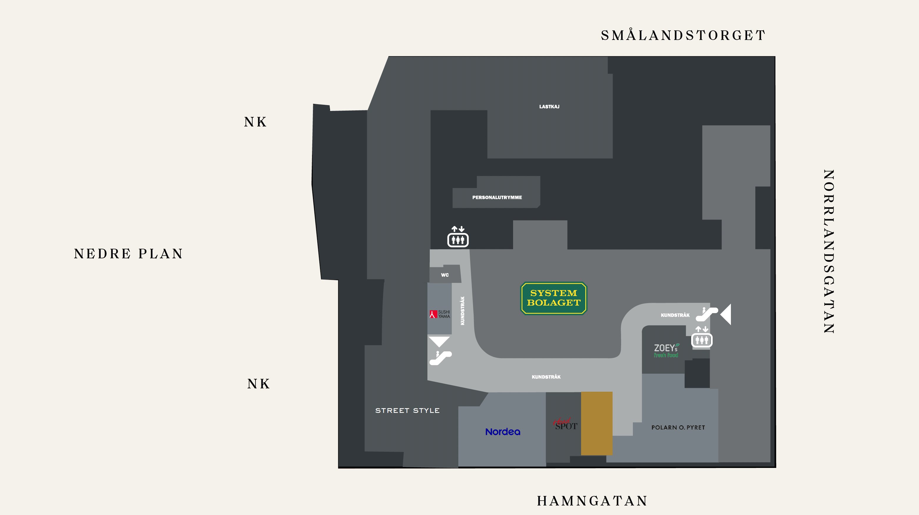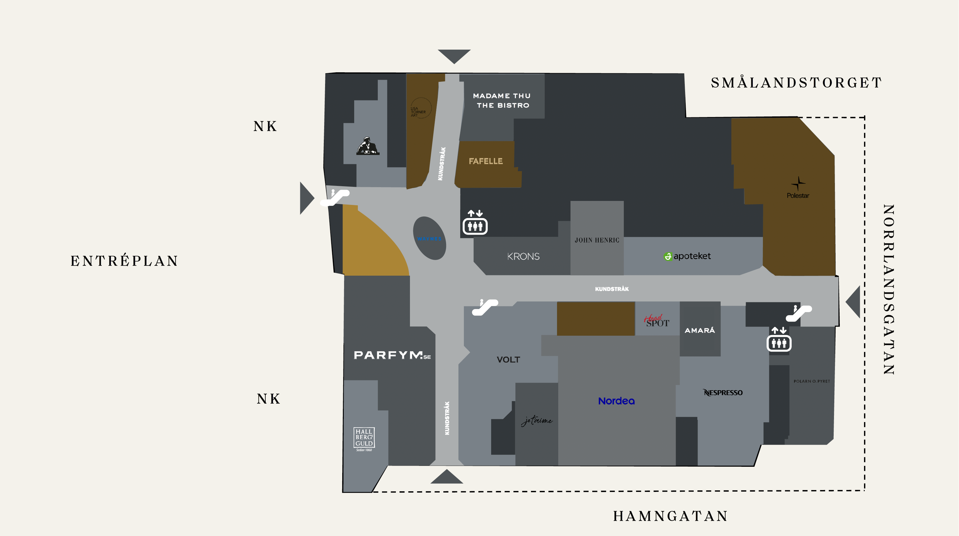 På entréplanet möts du av välkända varumärken, såsom Krons, Volt & John Henric samt Apotek och flera olika lunchalternativ. På nedre planet finns bland annat serviceaktörer såsom Systembolaget, fräscha restauranger och en frisörsalong.