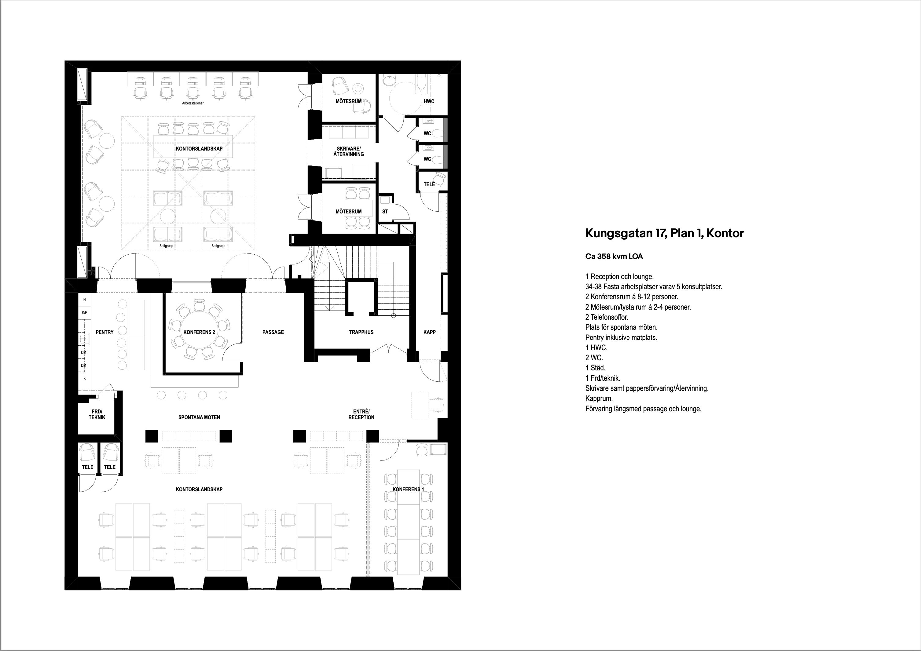 Välkommen till denna representativa lokal om 358 kvm, belägen en trappa upp i en byggnad ritad av Ivar Tengbom. Lokalen erbjuder generösa arbetsytor – den ena med utsikt över Kungsgatan och den andra med ett stort glasatrium som ger fantastiskt ljusinsläpp. Lokalen är extremt yteffektiv och lämpar sig för ca. 40 arbetsplatser! Vid entrén finner du ett stort konferensrum, tre mötesrum i olika storlekar samt tre telefon-/Teamsrum. Ett öppet kök binder samman arbetsytorna och skapar en naturlig mötesplats. Med smakfulla materialval och hög teknisk standard kombinerar lokalen modern funktionalitet med klassisk elegans. Kontakta ansvarig mäklare för visning!