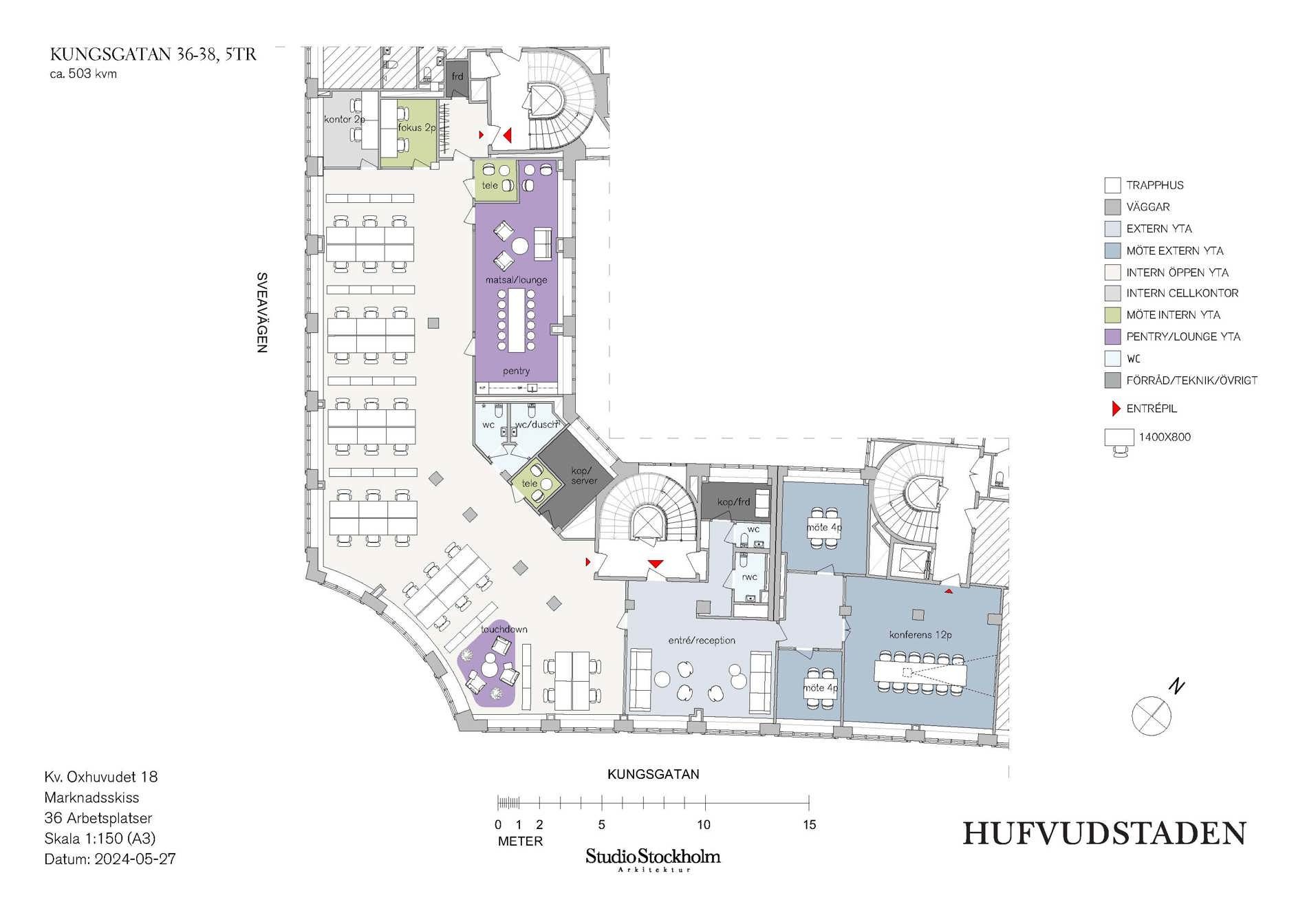 Högt upp en av Stockholms mest kända fastigheter, Oxhuvudet, även kallat Centrumhuset finns detta trevliga och ljusa kontor. Lokalen har öppen planlösning och plats för upp till 36 personer. Utöver kontorsplatserna rymmer lokalen även tre interna och tre externa mötesrum, pentry och loungeyta, samt fyra toaletter varav en med dusch. Garage och cykelparkering finns i fastigheten.